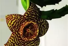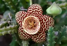 巨花犀角又称大豹皮花,是夹竹桃科犀角属的一种植物。茎粗,花大,边缘生长细毛。植株柱形多分枝呈丛生,柱形具4棱,棱缘具细小疣突。花大,五角星形黄色,并有横向棕褐色斑纹,似豹皮而得名。花期夏秋两季。…全部>>