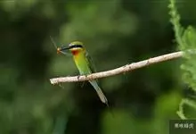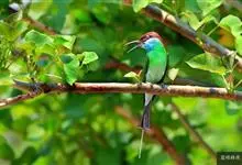 栗喉蜂虎是蜂虎科蜂虎属的鸟类。有热带鸟类羽毛艳丽的特征:喉部是栗红色的,黑色的过眼纹,翅膀和背部是绿色的,尾翼是蓝色的,飞行时翅膀下面的羽毛是橙黄色的,在阳光的照射下,它们全身闪烁着金属般的艳丽光泽,…全部>>