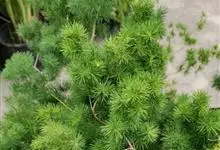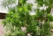 蓬莱松是天门冬科、天门冬属多年生丛生草本植物。宿存,圆柱形肉质根,纵截面为绿色和表面灰色。植株高可达3米。茎呈圆柱形或近四边形,底部木质化,具有灰色或灰褐色。幼嫩的茎在每个节上都被紫绿色鳞片包,…全部>>