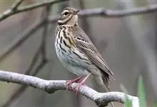 树鹨是小型鸣禽,外形和林鹨相似,体长15-16厘米。上体橄榄绿色具褐色纵纹,尤以头部较明显。眉纹乳白色或棕黄色,耳后有一白斑。下体灰白色,胸具黑褐色纵纹。野外停栖时,尾常上下摆动。…全部>>