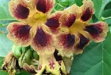 十字架树是紫葳科、葫芦树属小灌木,高3-6米。叶簇生于小枝上;小叶长倒披针形至倒匙形,几无柄,叶柄具阔翅。花1-2朵生于小枝或老茎上;花梗长约1厘米。花萼淡紫色。花冠褐色,具有紫褐色脉纹,近钟状,具…全部>>