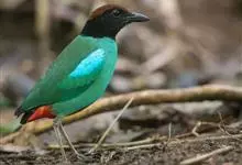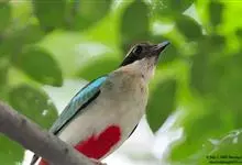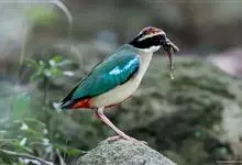 绿胸八色鸫:是雀形目八色鸫科的鸟类,共有12个亚种。体长为16-18厘米,体重65-69克。体型圆胖,尾短,腿长。头黑,上体绿色,两翼深色而具白色斑纹,头顶至后枕深褐,胸及腹部苹果绿,臀亮红。…全部>>