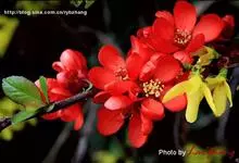 贴梗海棠Nakai)是蔷薇科、木瓜海棠属植物。落叶灌木,高达2米,枝条直立开展,有刺。叶片卵形至椭圆形,稀长椭圆形,长3-9厘米,宽1.5-5厘米。花先叶开放,3-5朵簇生于二年生老枝上。…全部>>