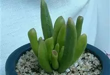 筒叶花月,是景天科青锁龙属的多年生草本植物。植株多分株,灌木状,茎较粗壮,圆柱形,表皮灰褐色;叶片肉质,互生,呈圆筒状,簇生于茎或分枝顶端,叶端呈斜截形,截面为椭圆形;花呈星状,淡白色;花期秋季。…全部>>