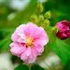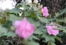 木芙蓉,锦葵科木槿属落叶灌木或小乔木。小枝上有细绒毛;叶片为卵状心形,托叶为披针形,常早落;花单生,花萼为钟形,花冠初为白色或淡红色,后逐渐变为深红色;果实为扁球形,有淡黄色的毛附着。花期8到10月。…全部>>
