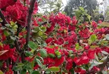 贴梗海棠 Nakai)是蔷薇科、木瓜海棠属植物。落叶灌木,高达2米,枝条直立开展,有刺。叶片卵形至椭圆形,稀长椭圆形,长3-9厘米,宽1.5-5厘米。花先叶开放,3-5朵簇生于二年生老枝上。…全部>>
