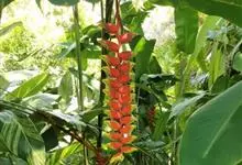 金嘴蝎尾蕉:芭蕉科,蝎尾蕉属多年生草本植物。株高可达6米。叶片长圆形,叶面绿色,叶背亮紫色;顶生花序,直立,薄被短柔毛;苞片绿色,开放时突露,花被片红色,顶端绿色,狭圆柱形,果三棱形,灰蓝色,有种子…全部>>