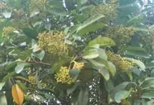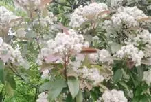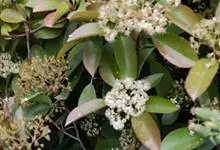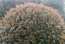石楠 Kalkman),是蔷薇科石楠属的常绿乔木,高5~12米,株型紧凑,树冠圆球形。树枝为褐灰色;鳞片为褐色,没有毛;叶片革质,长椭圆至侧卵状椭圆形,有锯齿,新叶红色光亮。复伞房花序,白色小花,…全部>>