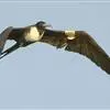 军舰鸟是鹈形目军舰鸟科军舰鸟属鸟类的通称,又称军人鸟。身体较小,腿又短又细,长有钩状嘴;翅膀细长,有很长的叉形尾巴。雄鸟体羽全黑,雌鸟大多数背部、头部和腹部为略带黑色的褐色,而胸部和腋距为白色。…全部>>