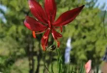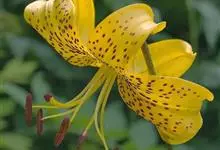 山丹是百合科百合属的多年生草本植物。鳞茎卵形或圆锥形,鳞片长圆形或长卵形,白色;叶散生茎中部,线形,边缘有乳头状突起;花单生或数朵成总状花序,花鲜红色,常无斑点,花被片反卷,…全部>>