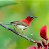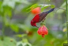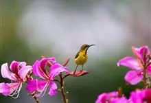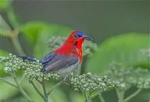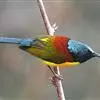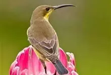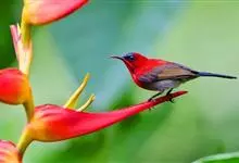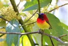 绿喉太阳鸟:共有9个亚种。小型鸟类,雄鸟体长13-15厘米、雌鸟10-12厘米。雄鸟前额至后颈、颏和喉辉绿色,头侧黑色,颈侧和背暗红色,两肩、下背橄榄绿色,腰鲜黄色,尾上覆羽和中央尾羽暗绿色,…全部>>
