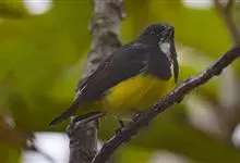 长嘴捕蛛鸟,小型鸟类,体长14-16厘米。嘴长而尖向下弯曲。上体橄榄绿色,眼先和短眉灰白色,两翅和尾暗褐色,外翈羽缘橄榄绿色,羽端灰褐色,自嘴基沿喉侧有一黑色纵纹。颏、喉灰白色,其余下体鲜黄色,…全部>>