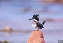 冠鱼狗是翠鸟科鱼狗属鸟类。体长约为24-26厘米,嘴粗直且长而坚硬,翼尖突出,尾巴短而圆,头部较大且颈部短。翅膀短而圆,脚非常短且趾弱细。头部有明显的羽冠。身体羽毛为黑色,…全部>>
