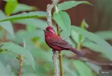 酒红朱雀小型鸟类,体长13~15厘米。雄鸟通体深红色,头部深朱红或棕红色,下背和腰玫瑰红色,眉纹粉红色而具丝绢光泽。两翅和尾黑褐或灰褐色、具暗红色狭缘,内侧两枚三级飞羽具淡粉红色先端。…全部>>