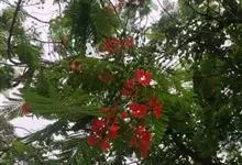 凤凰木 Raf.) ,别名火树、红花楹、凤凰花、火凤凰、金凤花、红楹,是豆科凤凰木属高大落叶乔木,树皮灰褐色,粗糙。二回偶数羽状复叶互生,矩圆形,两面均被柔毛。伞房式总状花序,花大,花瓣5枚,圆形,…全部>>