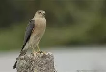 褐耳鹰的体形比苍鹰要小得多,为小型猛禽,体长为31-44厘米,体重217-325克。上体灰色,下体具赤褐色横斑。第6枚初级飞羽外羽片无缺刻,次外侧的4对尾羽具5道黑褐色横斑。眼先具白色短羽。…全部>>