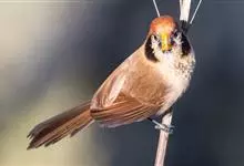 点胸鸦雀是莺科、鸦雀属小型鸟类,体长18-21厘米。头顶至枕橙棕色,嘴橙黄色、短而粗厚,脸皮黄色,耳覆羽和颊后部黑色,眼圈白色。上体棕褐色。颏黑色,其余下体淡皮黄白色,喉和上胸具黑色矢状斑。…全部>>