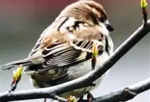 家麻雀:共有13个亚种。是小型鸟类,体长14-16厘米。背栗红色具黑色纵纹,两侧具皮黄色纵纹;颏、喉和上胸黑色,脸颊白色,其余下体白色,翅上具白色带斑。雄鸟与树麻雀的区别在顶冠及尾上覆羽灰色,耳无黑…全部>>