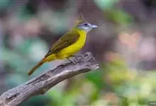 黄腹冠鹎:体长19-24厘米,是一种体型略大的褐色鹎。头顶橄榄褐色具黑褐色羽冠。白色的喉膨起,下体黄色。似白喉冠鹎但较鲜亮,上体褐色较重,腹部为鲜亮的柠檬黄色。虹膜褐色;嘴黑色;脚粉红色。…全部>>