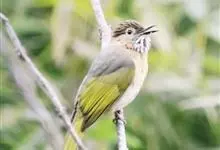 绿翅短脚鹎是鹎科、短脚鹎属的鸟类。共有9个亚种。中型鸟类,体长20-26厘米。头顶羽毛形尖、栗褐色具白色羽轴纹,在暗色的头部极为醒目。上体灰褐缀橄榄绿色,两翅和尾亮橄榄绿色。耳和颈侧红棕色,颏、喉灰色,…全部>>