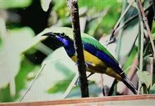 蓝翅叶鹎:小型鸟类,体长15-18厘米。雄鸟通体草绿色,尾蓝绿色,肩和翅亮蓝 色,胸缀有黄色,颏、喉黑色。雌鸟颏,喉蓝绿色。栖息在海拔1500米以下的常绿阔叶林、次生林和林缘疏林灌丛中。…全部>>