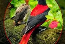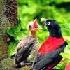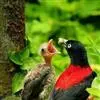 朱鹂:中等鸟类,体长23-28厘米。雄鸟绛紫红色,头、上胸及翼黑色。雌鸟上背及背部深灰色,尾覆羽及尾绛紫红色,腹部及下胸白而密布黑色纵纹。与鹊色鹂幼鸟的区别在上背灰色较深,下体白色较少且纵纹较粗。…全部>>