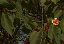 欧李,蔷薇科李属落叶灌木植物,高1.5米。树皮灰褐色,小枝被柔毛;叶互生长圆形或椭圆状披针形;花与叶同时开放,单生或并生,花瓣白色或粉红色;核果近球形,熟时鲜红色或橘黄色。花期4-5月,果期5-6月。…全部>>