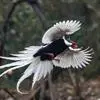 白鹇,是鸡形目雉科鹇属的一种留鸟。雄鸟上体白色并具黑色纹,下体黑色,头顶具黑色长羽冠,尾白而长;雌鸟体型较小,以橄榄褐色为主,下体具白色或皮黄色细纹;虹膜褐色,眼周具红色裸皮,喙黄色,脚鲜红色。…全部>>