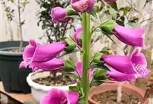 毛地黄是车前科、毛地黄属一年生或多年生草本植物。株高0.5—1米,茎直立,少分枝,全株被灰白色短柔毛和腺毛叶基生,呈莲座状,卵圆形或卵状披针形。顶生总状花序,花冠钟状,紫红色,内面有浅白斑点。菊果卵形。…全部>>