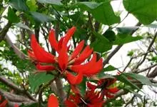 鸡冠刺桐是豆科、刺桐属落叶灌木或小乔木,茎和叶柄稍具皮刺。羽状复叶具3小叶;小叶长卵形或披针状长椭圆形,花与叶同出,总状花序顶生,每节有花1-3朵;花深红色,荚果长约15厘米,褐色,种子间缢缩;种子大,…全部>>