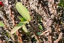 虎刺梅:别称铁海棠,是蔓生灌木植物。茎多分枝,长60-100厘米,直径5-10毫米,具纵棱,密生硬而尖的锥状刺,刺长1-1.5厘米,直径0.5-1.0 毫米,常呈3-5列排列于棱脊上,呈旋转。叶互生…全部>>