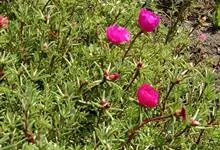 大花马齿苋:一年生草本,高10-30厘米。茎平卧或斜升,紫红色,多分枝,节上丛生毛。叶密集枝端,较下的叶不规则互生,叶片细圆柱形,无毛。花单生或数朵簇生枝端,直径2.5-4厘米,…全部>>