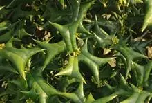 构骨叶冬青学名枸骨,又名猫儿刺、老虎刺、八角刺、鸟不宿、构骨、狗骨刺、猫儿香和老鼠树。常绿灌木或小乔木,高1-3米,二年枝褐色,三年生枝灰白色,叶片厚革质,花淡黄色,果球形,直径8-10毫米,成熟时…全部>>
