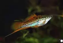 孔雀鱼,是鳉形目花鳉科花鳉属鱼类。孔雀鱼体形修长,其形态变化主要在尾鳍,常见的尾鳍形态有圆尾、尖尾、铲尾等。雌、雄鱼差别明显,雄鱼的大小只有雌鱼的一半左右,雄鱼体色丰富多彩,尾部形状千姿百态。…全部>>