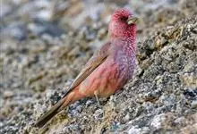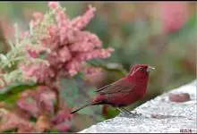 酒红朱雀小型鸟类,体长13~15厘米。雄鸟通体深红色,头部深朱红或棕红色,下背和腰玫瑰红色,眉纹粉红色而具丝绢光泽。两翅和尾黑褐或灰褐色、具暗红色狭缘,内侧两枚三级飞羽具淡粉红色先端。…全部>>