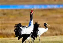 黑颈鹤:是鹤科、鹤属的大型涉禽,体长110-120厘米,体重4-6千克。颈、脚甚长,通体羽毛灰白色,头部、前颈及飞羽黑色,眼先和头顶前方裸露的皮肤呈暗红色,尾羽褐黑色。头顶,三级飞羽的羽片分散,…全部>>