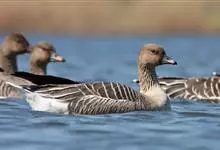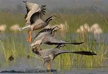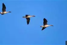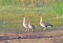 灰雁:体长70-90厘米,翼展147-182厘米,体重2.5-4千克,寿命17年。体大而肥胖。嘴、脚肉色,上体灰褐色,下体污白色,飞行时双翼拍打用力,振翅频率高。脖子较长。腿位于身体的中心支点,…全部>>