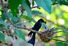 发冠卷尾是中型鸟类,体长28-35厘米。通体绒黑色缀蓝绿色金属光泽,额部具发丝状羽冠,外侧尾羽末端向上卷曲。栖息于海拔1500米以下的低山丘陵和山脚沟谷地带,多在常绿阔叶林、次生林或人工松林中活动。…全部>>