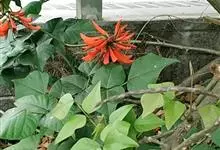 翅果刺桐 Merr.)是豆科,刺桐属乔木,高12-15米,具粗壮的刺。羽状复叶具3小叶,小叶膜质,卵状三角形,先端短渐尖,基部圆或宽楔形,两面无毛;总状花序长7-10厘米,有褐色绒毛;花红色,花萼钟状,…全部>>