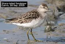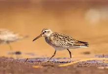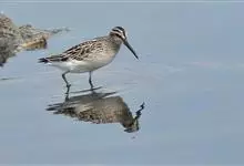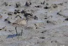 阔嘴鹬是涉禽,体长17厘米。特征为翼角常具明显的黑色块斑并具双眉纹。与黑腹滨鹬平滑下弯的嘴相比,阔嘴鹬的嘴具微小纽结,使其看似破裂。上体具灰褐色纵纹;下体白,胸具细纹;腰及尾的中心部位黑而两侧白。…全部>>