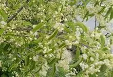 稠李是蔷薇科、李属的乔木。株高达15米;幼枝被绒毛,冬芽无毛或鳞片边缘有睫毛;叶椭圆形、长圆形或长圆状倒卵形,基部圆或宽楔形,有不规则锐锯齿,花序梗和花梗无毛,萼筒钟状,萼片三角状卵形,花瓣白色,…全部>>