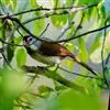 点胸鸦雀是莺科、鸦雀属小型鸟类,体长18-21厘米。头顶至枕橙棕色,嘴橙黄色、短而粗厚,脸皮黄色,耳覆羽和颊后部黑色,眼圈白色。上体棕褐色。颏黑色,其余下体淡皮黄白色,喉和上胸具黑色矢状斑。…全部>>