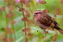 红眉朱雀:体长15厘米,是一种中等体型的朱雀。上体褐色斑驳,眉纹、脸颊、胸及腰淡紫粉,臀近白。雌鸟无粉色,但具明显的皮黄色眉纹。雄雌两性均甚似体型较小的曙红朱雀,但嘴较粗厚且尾的比例较长。…全部>>