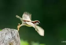 家麻雀:共有13个亚种。是小型鸟类,体长14-16厘米。背栗红色具黑色纵纹,两侧具皮黄色纵纹;颏、喉和上胸黑色,脸颊白色,其余下体白色,翅上具白色带斑。雄鸟与树麻雀的区别在顶冠及尾上覆羽灰色,耳无黑…全部>>