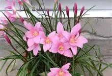 小韭兰学名韭菜莲又名风雨花、菖蒲莲、红玉帘和旱水仙,多年生草本,鳞茎卵球形,基生叶常数枚簇生,线形,扁平,花单生于花茎顶端,下有佛焰苞状总苞,花玫瑰红色或粉红色,蒴果近球形,种子黑色,花期夏秋。韭莲…全部>>