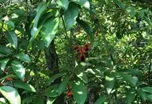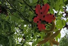 假苹婆是锦葵科苹婆属乔木植物。幼枝被毛;叶椭圆形或披针形,先端骤尖,基部钝或近圆无毛;圆锥花序腋生,花淡红色;蓇葖果鲜红色,长卵圆形或长椭圆形;种子卵圆形黑褐色;花期4-6月。…全部>>
