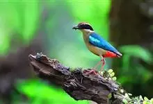 蓝翅八色鸫是雀形目八色鸫科的鸟类。体长17-20厘米,体重类约48-70克,体型圆胖,尾短,腿长,以身体具有红、绿、蓝、白、黑、黄、褐、栗等鲜艳夺目,丰富艳丽的色彩而得名,是很有观赏价值的鸟类。主要…全部>>