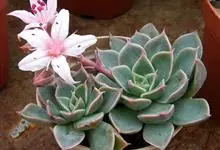 胧月 E.Walther)是景天科,风车草属多肉植物,常绿蔓生亚灌木,叶肥厚无柄,灰蓝色,阳光充足时呈粉红色,叶片枝顶簇生成莲座状,乳白色,花冠5裂,上有紫红色斑点,雄蕊两轮排列,花药鲜红色,…全部>>