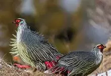 血雉雉科血雉属鸟类,别名血鸡、松花鸡,血雉的雄鸟大覆羽、尾下覆羽、尾上覆羽、脚、头侧、腊膜为红色,故称血雉。其别名甚多,各地皆异。在甘肃,因其胸侧和翅上覆羽沾绿,被称为“绿鸡”;因其羽毛形似柳叶,…全部>>
