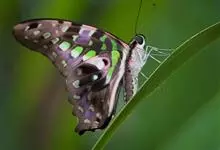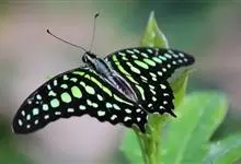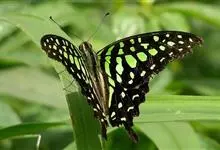 青带凤蝶Graphium sarpedon ,又名青凤蝶,是最普遍的中型凤蝶,飞行速度很快。青带凤蝶的翅膀中央有许多浅蓝色的斑点,很整齐地排列成一条直线。这些斑点由上而下逐渐变大,就像一条青色的带子。全部>>